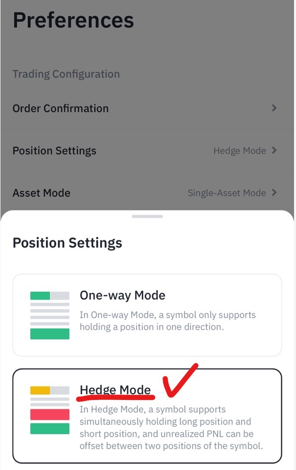 - 아래의 헷지 모드(Hedge Mode)를 선택하면, 포지션 셋팅이 헷지 모드로 바뀌어 있는 것을 확인 할 수 있습니다.